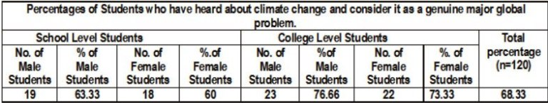 From Table-1, it is seen that regarding sex and class, the percentage of the male students who have heard about global warming and climate change and consider it as a genuine major problem affecting the entire humanity was higher than their female counterparts for both the two segments (school level and college level) of the population under study. Male students seem to know more than their female counterparts. 66.33 per cent school level male students know that global climate change is a genuine problem confronting the entire humanity, whereas it was only 60 per cent at school level female students. Similarly, it was 76.66 per cent at college level male students and 73.33 per cent with regard to college level female students.