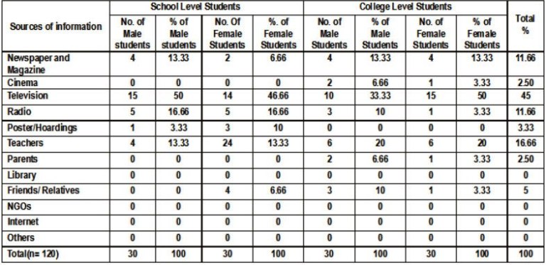 Here purpose sampling technique was adopted and samples comprised of school level (class IX, X, XI, XII) and college level students who are currently studying in any of the science, arts and commerce streams in undergraduate classes was considered. A total of 120 students (both male and female, n=120) had participated in the survey. Care was taken to include equal number of male and female students, so that there would not be any disparity regarding sex /representation of the respondents. Hence 30 male students and 30 female students from each of the school and degree classes were selected as representative sample for the study. A closed-ended questionnaire survey was administered to a total of 120 school and college students in the month of June 2012.The students surveyed included students studying in both government and private educational institutions.