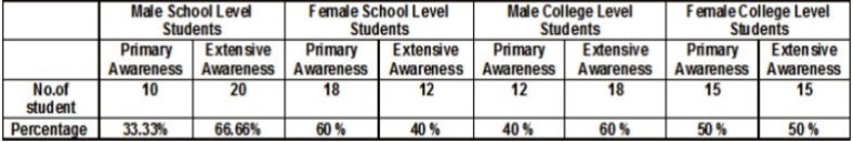 Next, it was sought to gauge the overall level of awareness on climate change among the students under study. Certain questions were put for this purpose. Those students who answered all the questions correctly were placed in the category that had extensive awareness of global climate change and students who answered only some of the questions correctly were placed in the category that had primary awareness of global climate change. It was found from the Table-2 that 40 per cent of the school level female students had extensive awareness of different aspects of global climate change. It was 66.66 per cent for their male counterparts, which is a bit higher than their female counterparts at the school level. In case of college students, 60 per cent college level male students had extensive awareness of global climate change which was 10 per cent higher than their female counterparts.
