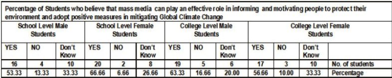 Table-4 reflects that 53.33 per cent school level male and 63.33 per cent of college level male students feel that mass media can play an effective role in informing and motivating people to protect their environment and adopt positive measures in mitigating global climate change and biodiversity loss . It was found that 66.66 per cent school level female and 56.66 per cent of college level female students feel that mass media can play an effective role in informing and motivating people to protect their environment and adopt positive measures in mitigating global climate change.