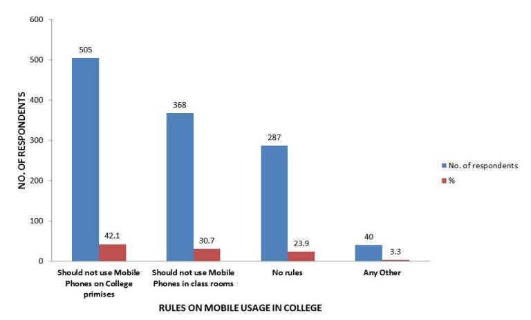 A clear majority (57.6%) of respondents opined that they should have rules for mobile phone usage in colleges and 42.4% negated the opinion.