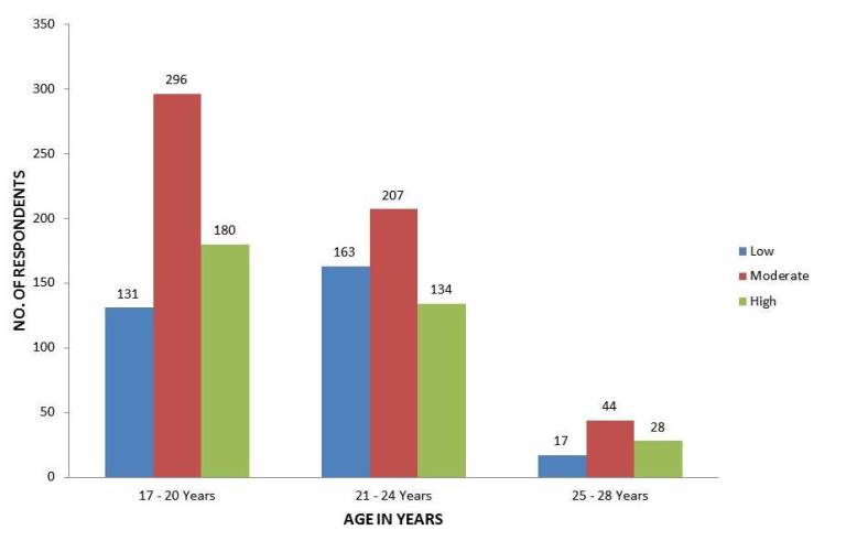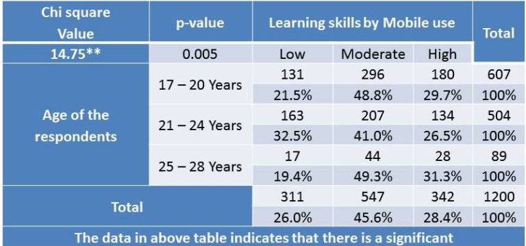 The data in the above table indicates that there is a significant relationship between age group of respondents on learning skills by mobile use. This tendency is high (31.3%) and moderate (49.3%) among respondents in the 25-28 year age group and is low among those in the 21-25 year (32.5%) age group.