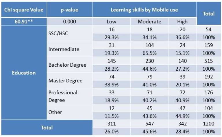 There is a significant relationship between education and learning skills of respondents through mobile use. It is highly observable among those who have professional (40.9%) and low among those who have SSC/HSC degrees.