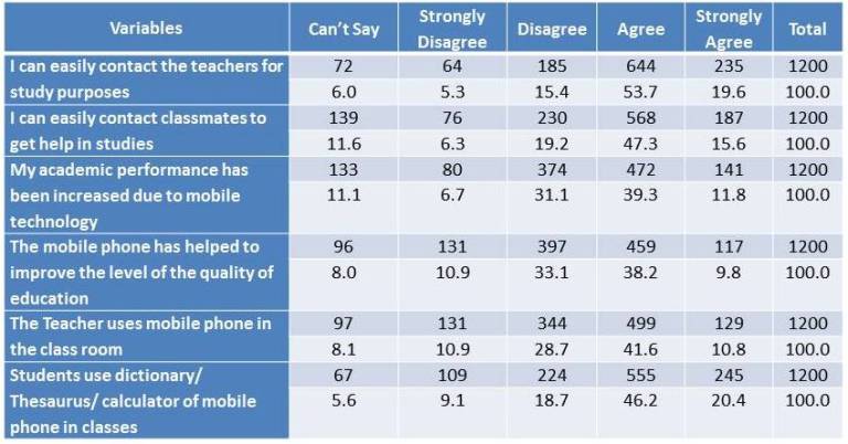Mobile phone is also helpful for the students for exchanging useful information with their classmates about their studies. Students use this fascinating device also in better ways. Some of the studies proved that this technology has increased the academic performance. In this context the study tried to find out the positive effects on learning achievements of youth. A majority (53.7%) agreed that they can easily contact the teachers for study purposes. 19.6% strongly agreed that they contact the teachers for this purpose. 47.3% of respondents agreed that they can easily contact their classmates for help in studies. 39.3% agreed that their academic performance has improved due to mobile technology whereas 31.1% disagreed. 38.2% agreed that mobile phone has helped to increase the level of quality of education whereas 33.1% disagreed. 41.6% agreed that teachers use mobiles in class rooms. Majority (46.2%) use it as dictionary/thesaurus/calculator in class rooms and 20.4% strongly agreed.
