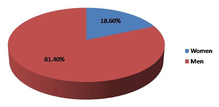 Despite these endeavours regarding women emancipation, the situation does not look any better. The statements quoted above make it obvious that the small representation of women in journalism is a big concern not only in India but also in other countries. In preparing the Global Report on the Status of Women in the News Media, 17 Indian news companies participated (ten newspapers, six television stations, and one radio station). In this report, Byerly (2011) writes that in India all the participating companies (in the study) together employ approximately 30,000 employees, of which 2,405 are female journalists and 10,518 are male journalists. This is a ratio of 4:1, as men outnumber women in these companies, as shown in Figure 1.