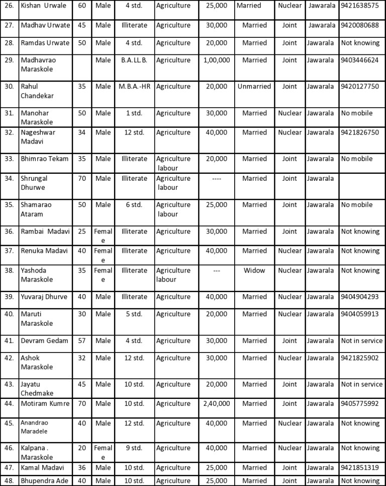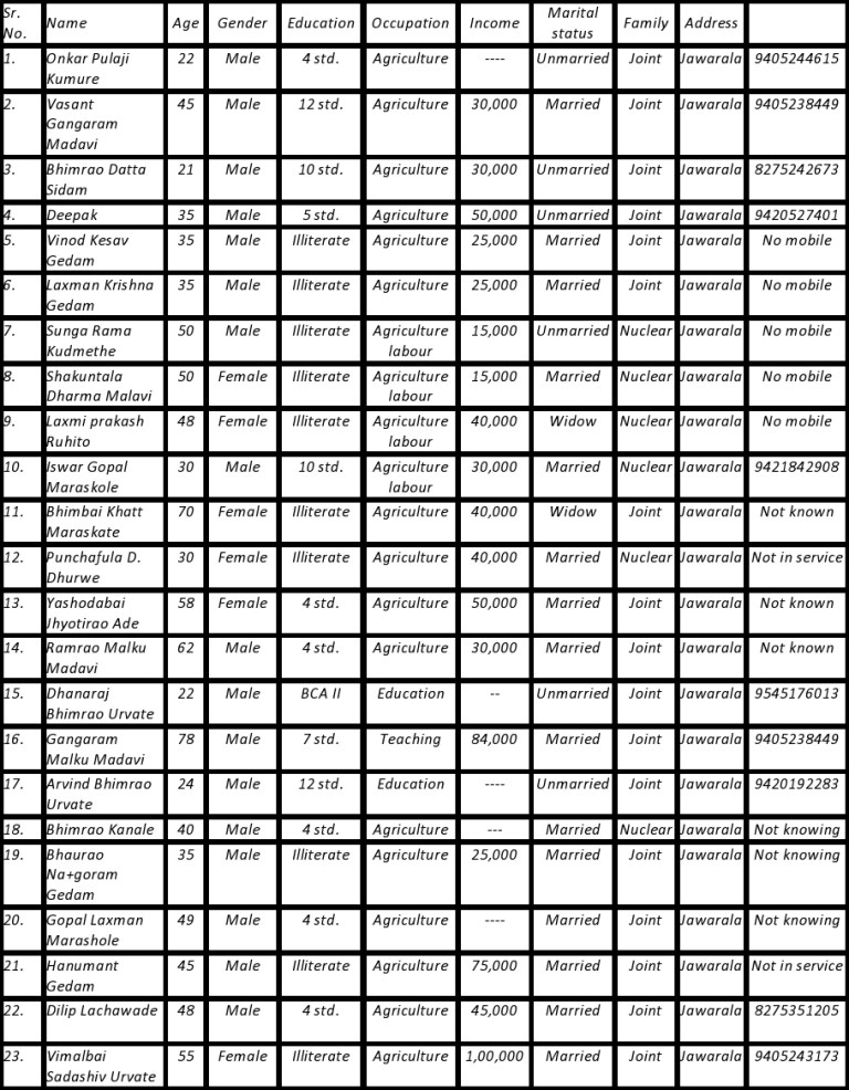 - Survey of 50 Gond people conducted in Jawarala Village, Kinwat Taluka, District Nanded State of Maharashtra,India