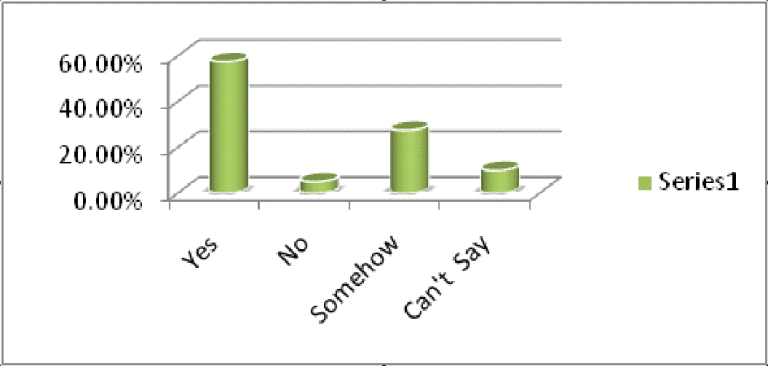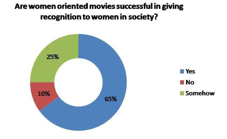 Conclusion: This hypothesis is proved correct in many cases. On being asked how often do they see the films, 37 percent students see films 2-5 times in a month and 35 percent students see films once in a month. Similarly, in case of liking towards women oriented movies 75 percent students says ‘yes’ as they show interest in watching women oriented films. When asked whether they like female lead character in women oriented films, 46 percent students like the independent women role. Similarly, when asked if women oriented movies are successful in giving recognition to women in society, 65 percent say ‘yes’ and 25 percent say ‘somehow’. To the question whether they think that women oriented Hindi films are good for women college students, 77.5 percent students expressed agreement.