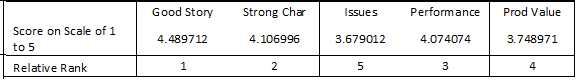 “Good story line” received the highest score and rank 1, followed by “strong characterization” and “performances of actors”. “Issues tackled” and “production values” received relatively lower scores. (See Table 1).