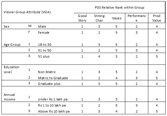 Table 3: Viewer Preference Determinant Scores (VPDS): Relative Ranks by Viewer Group Attribute (VGA)