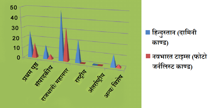 उपरोक्त ग्राफ के द्वारा यह समझा जा सकता है कि एक जैसी घटना को कैसे अलग- अलग ट्रीटमेंट दी गयी है। दिल्ली की घटना और मुंबई की घटना यानी दामिनी बलात्कार की घटना और फोटो जर्नलिस्ट की घटना ने समाचार पत्र के सभी पन्नों पर स्थान पाया है, अंतर्राष्ट्रीय पन्ने को छोड़ कर। लेकिन तुलनात्मक रूप से अगर विश्लेष्ण किया जाये तो ख़बरों की प्रमुखता उन्हें दिए गये पन्नों के आधार पर तय हो जाती है। दिल्ली का हिन्दुस्तान दैनिक के 15 दिनों (17 दिसंबर से 31 दिसंबर, 2012) का संस्करण और मुंबई के नवभारत टाइम्स के 15 दिनों (24 अगस्त से 7 सितम्बर, 2013) के संस्करण का पृष्ठ के आधार पर ख़बरों को दिया गया स्थान इस प्रकार है,