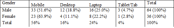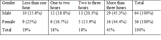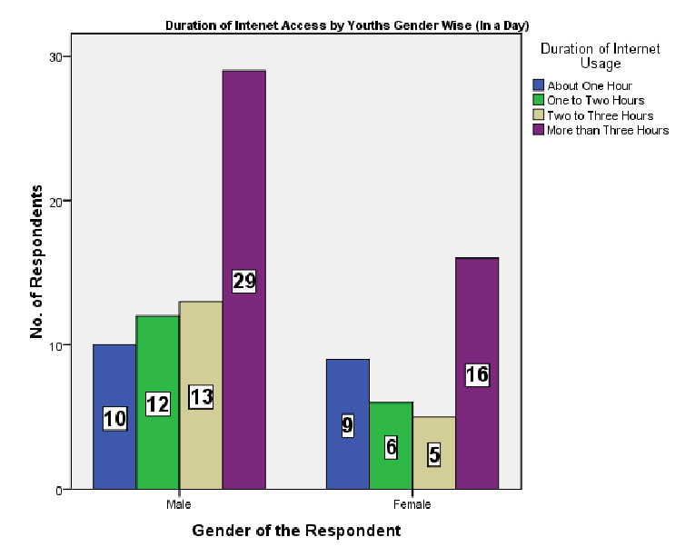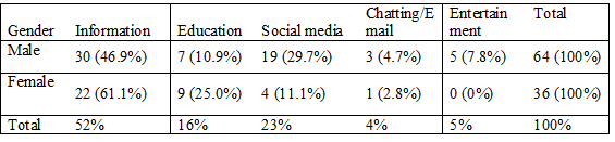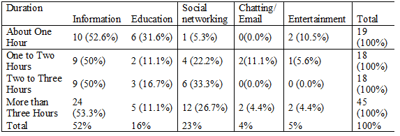As the table shows, it was found that most youths devote 45 percent of their time (more than three hours) to the internet, while 19 percent devote less than an hour daily. For those who use the internet for one to two hours and two to three hours in a day respectively, the percentages are equal, i.e. 18 percent. There is a slight difference-of 0.9 per cent-between male and female students using the internet for more than three hours a day. More females (about 9.4 percent higher) than males use the internet for an hour daily. Among the men surveyed, about 20 percent use the internet for two to three hours, while about 14 percent of females use it for the same duration daily. There is a difference of about 2 percent between males and females who use the internet every day for one to two hours. So, 45 percent of males and females with less than one percent difference between them-use the internet daily for more than three hours.
