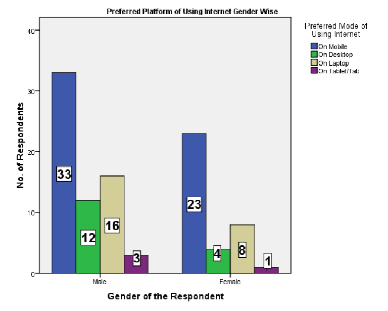 More than half of the youth use the internet on the mobile-33 out of 64 male respondents, at a percentage of about 50, and 23 out of 36 female respondents, at a percentage of about 64. In total, the figure stands at 56 percent youth accessing the internet on the mobile and about 24 percent using the laptop for surfing. About one-fourth of the males and females surveyed prefer to use the internet on the laptop. The desktop is the third preferred machine for using the internet with 16 percent, followed by tablets with 4 percent. Mobile is the most favorite platform of internet users has also been shown in the IAMAI study, which underlines that the mobile internet user base is expanding more than other platforms.