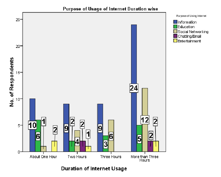 More than half the youth who use the internet daily access information for different durations in which the maximum period is more than three hours. About one-fourth of the youth spend time for social networking over the internet in which two to three hours in a day is the maximum time devoted. Internet usage for education is about 16 percent and about 32 percent use the internet for about one hour a day. Youth rarely give time to entertainment and chatting or emailing, with only five and four percent, respectively, going for it. About 10 percent of youth, who use the internet for about an hour daily use it for entertainment.