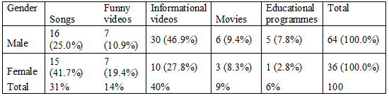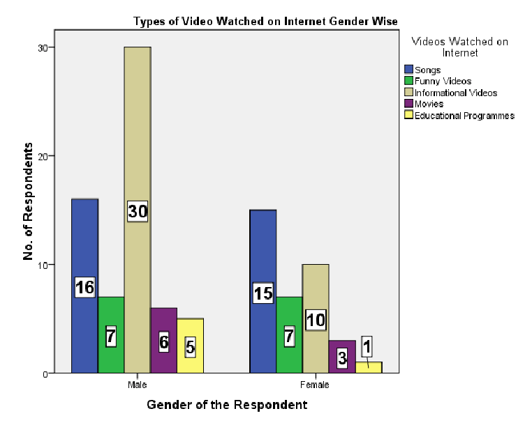 Informational videos are most viewed by the youth on the internet, i.e. 40 percent and 31 percent of the young generation prefers to watch informational videos and listen to songs on the internet. About 45 percent of males use the internet for informational videos and one-fourth of them use it for listening to songs.
