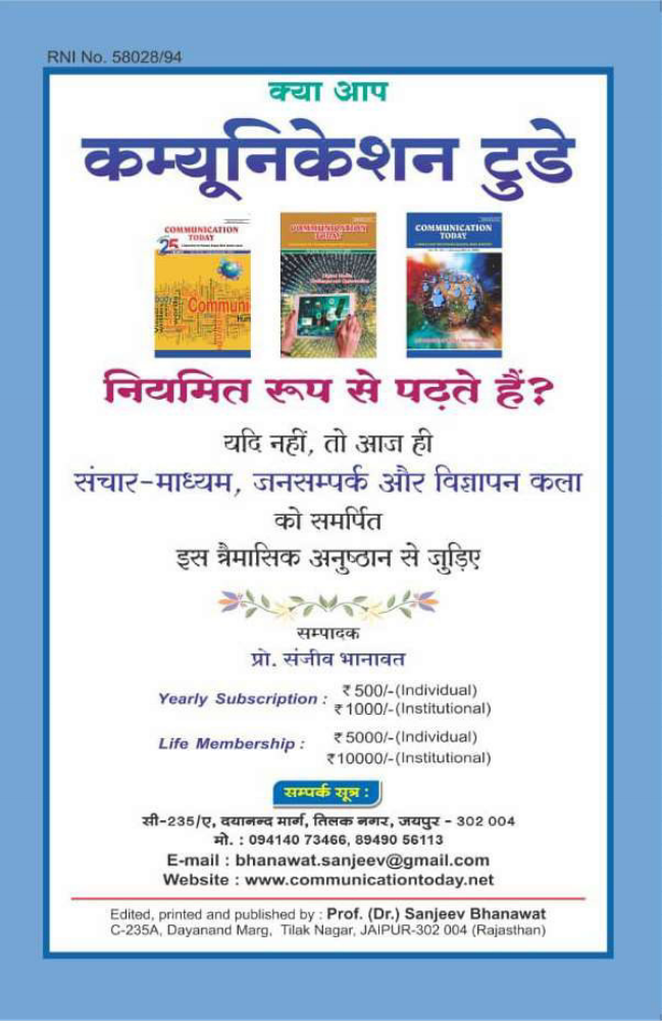 September 6, 2022September 6, 2022communicationtoday11Leave a Comment on New Edition (July-Sept., 2022) New Edition (July-Sept., 2022) Read Full Edition of Communication Today (July-Sept., 2022) Read Full Edition of Communication Today (July-Sept., 2022) Share this: Click to share on X (Opens in new window) X Click to share on Facebook (Opens in new window) Facebook Like Loading... Related