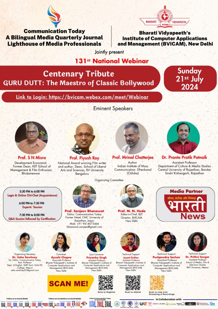 Jul 23, 2024 | 06:00 PM - 131th Media Lecture Series: Centenary Tribute GURU DUTT: The Maestro of Classic Bollywood