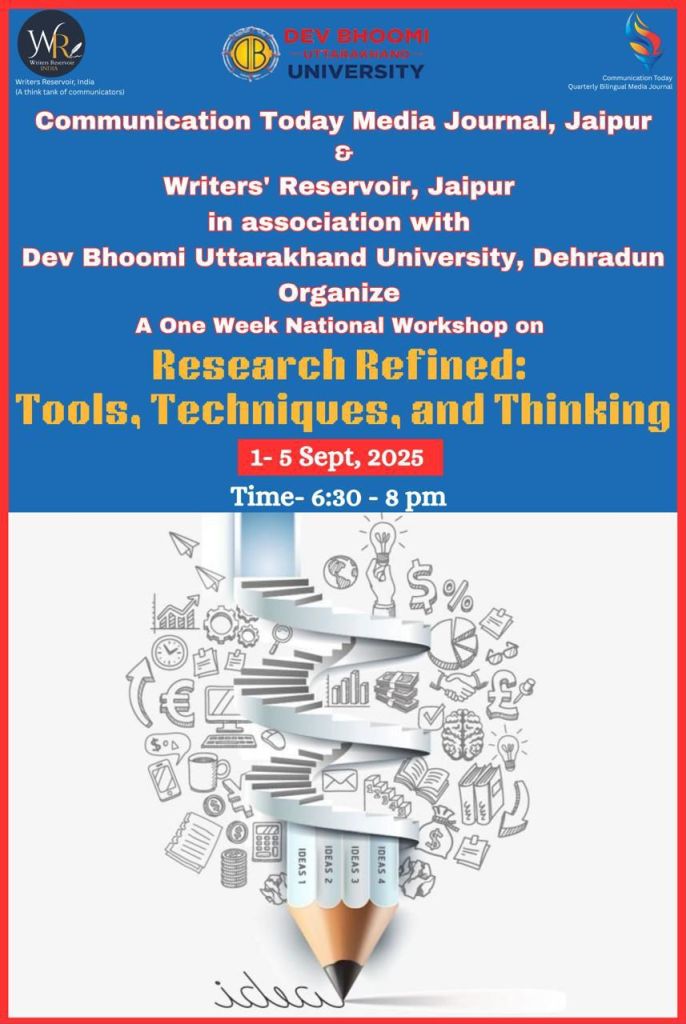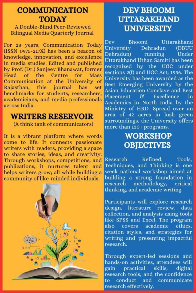 Communication Today Media Journal and Writers’ Reservoir, Jaipur in association with Dev Bhoomi Uttarakhand University, Dehradun Present a One-Week National Workshop on: