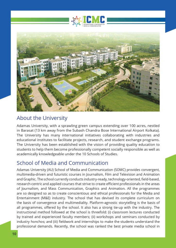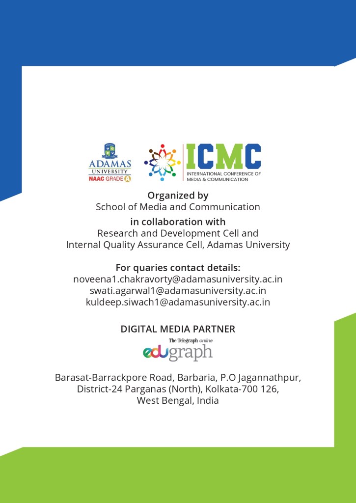 The School of Media and Communication at Adamas University, in collaboration with the Research and Development Cell and IQAC, is proud to announce the 4th International Conference of Media and Communication (ICMC-IV).